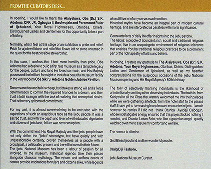 In May 2014, the longest reigning Yoruba monarch, Alaiyeluwa, Oba (Dr.) S.K. Adetona, the Awujale of Ijebuland, turned 80 years old. To celebrate the auspicious occasion, the Council of High Chiefs (Otunbas), on behalf of other Ijebu kings and citizens of Ijebuland decided to build a modern museum as a tribute to their beloved monarch. The distinct honor of founding the historical museum was invariably entrusted to Craig Fashoro, based on his accomplishments in the field of traditional African art and his proposed vision of what the desired museum should be like.